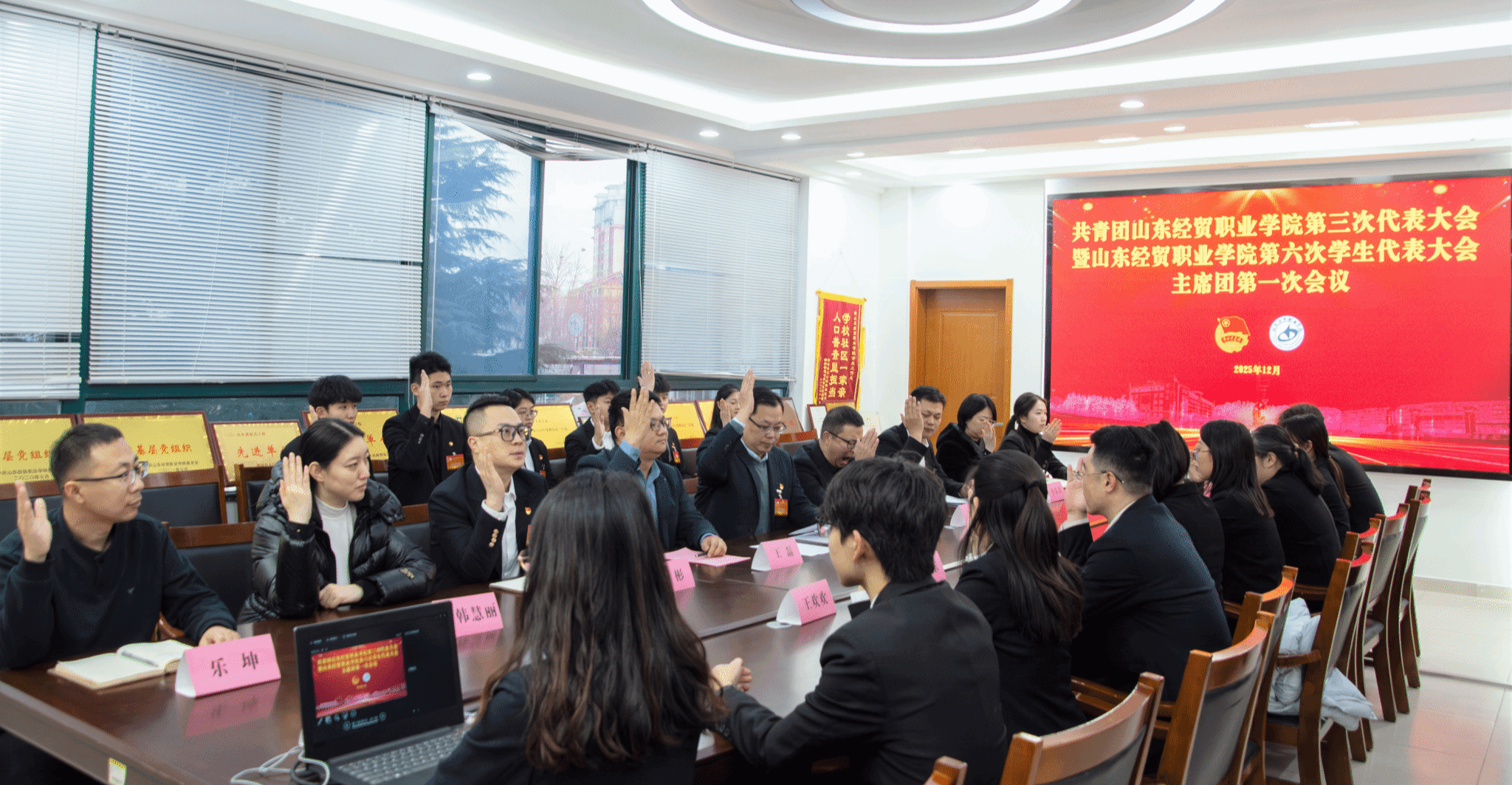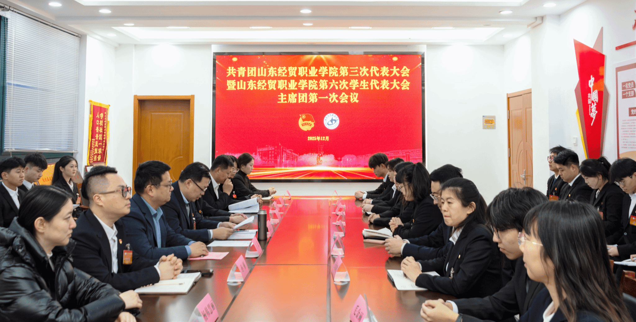 12月25日,共青团山东经贸职业学院第三次代表大会暨山东经贸职业学院第六次学生代表大会在学院大学生活动中心召开。学院党委书记高志秀,党委副书记、院长陈卫国,共青团潍坊市委书记李飞出席会议。学院领导班子成员、共青团潍城区委书记、驻潍高校团委书记、学校相关职能部门负责人、各系部党总支书记出席大会。辅导员代表、青年教师代表、往届团委委员代表、学生会委员代表共300多人参加会议。