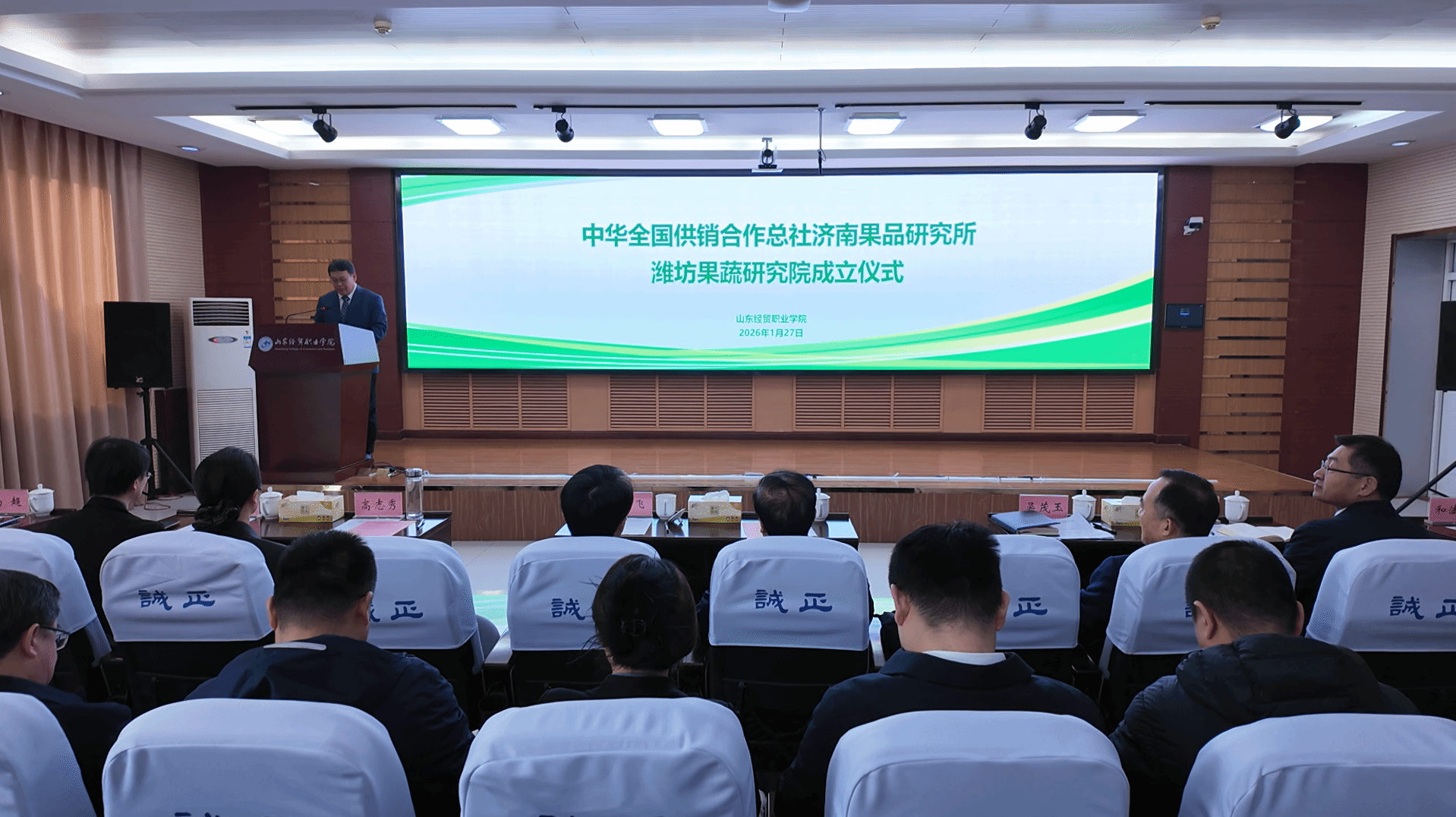 1月27日上午,中华全国供销合作总社济南果品研究所潍坊果蔬研究院成立仪式在学院第二报告厅举行。山东省供销合作社联合社党组副书记、监事会主任秦维强出席仪式并讲话。潍坊市委副书记、政法委书记郭飞,中华全国供销合作总社济南果品研究所党委书记、所长吴茂玉,学院党委书记高志秀,党委副书记、院长陈卫国,济南果品研究所党委副书记、纪委书记宋烨,济南果品研究所党委委员、副所长和法涛,党委委员、功能食品研究中心主任马超;潍坊市农业农村局党组书记、局长刘煜,潍坊市供销合作社联合社党组书记、理事会主任侯法强等领导出席仪式。仪式由学院党委副书记王炳华主持。