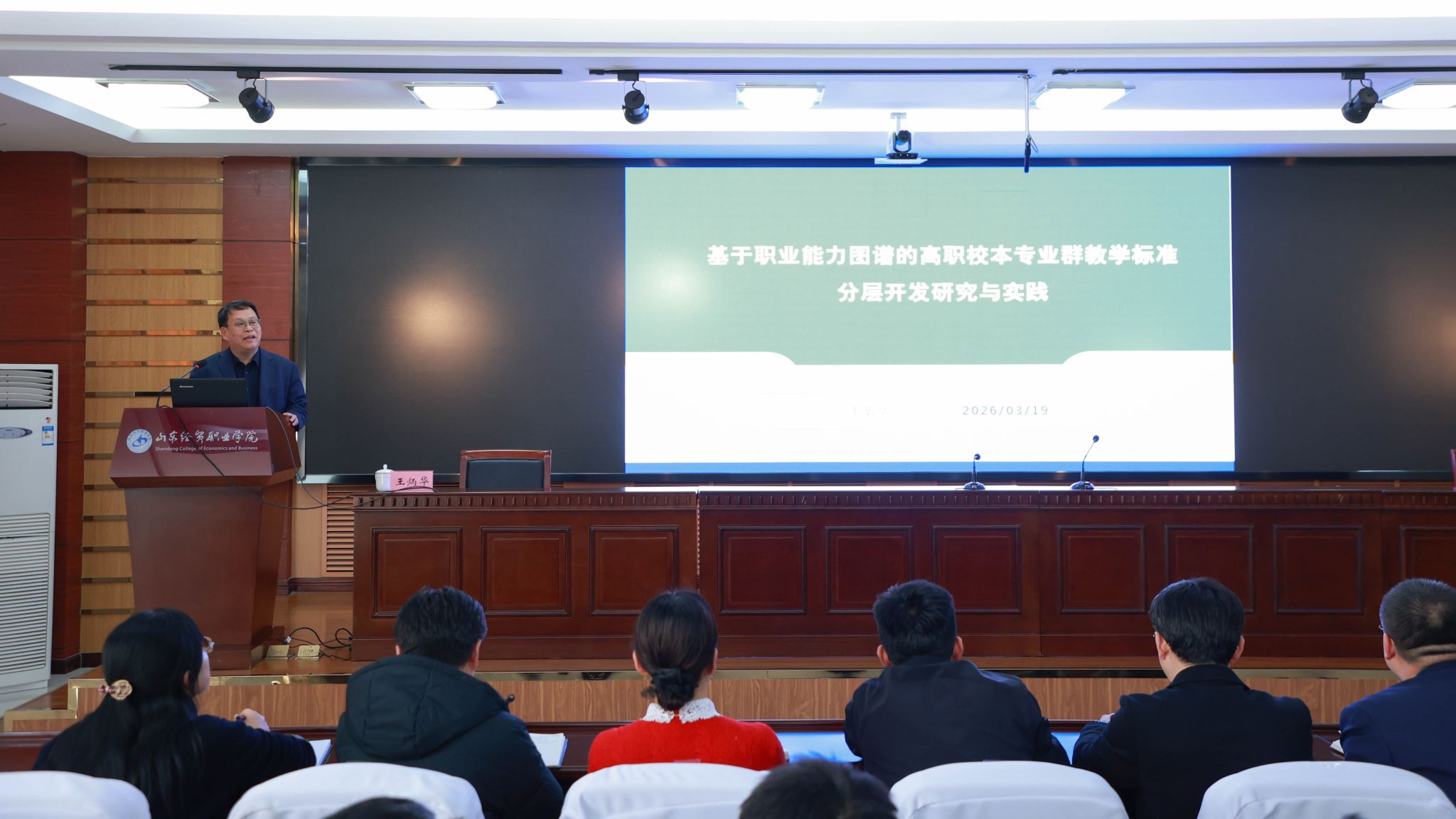 学院党委副书记王炳华教授以《基于职业能力图谱的高职校本专业群教学标准分层开发研究与实践》为题作专题报告。报告分析了高职校本专业群教学标准开发存在的问题,对专业教学标准开发、课程模式、校本专业群教学标准开发的理论研究和实践探索作了系统阐述,提出了“三层五步”校本专业群教学标准开发路径。