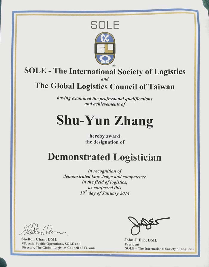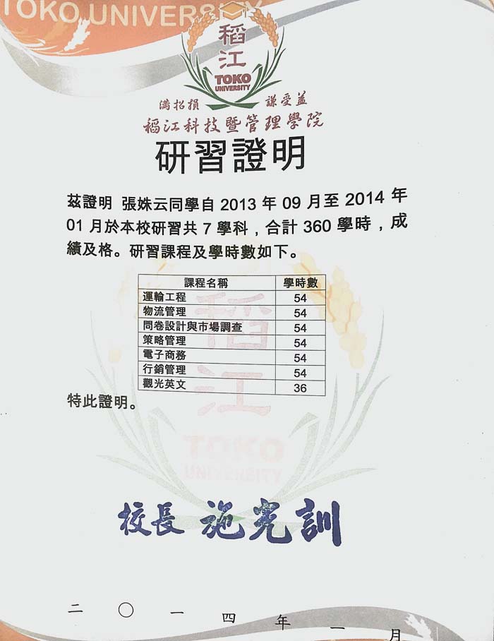 2014年3月3日,我院郭彦麟等九位同学在台湾稻江科技暨管理学院研习的成绩单及研习证明寄达我院,随同寄来的还有其中四位同学在台湾学习期间考取的 “物流助理管理师”证书,此证由美国国际物流协会(SOLE)颁发,在国际上具有很高的认可度。