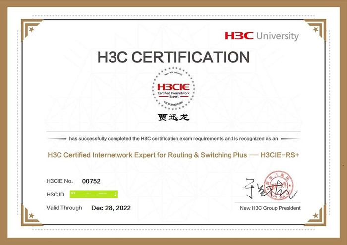 我院2018级计算机网络技术专业学生贾迅龙通过新华三互联网专家考试,获取H3CIE-RS+职业资格证书,成为全国第752位新华三路由交换互联网专家,是我院计算机类专业继滕川、牟帅后的第3位IE证书获取学生。