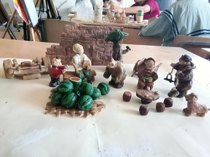 “玩泥巴”是同学们小时候的最爱,大学里开设这类手工课更能够让学生放下手机,进行手眼结合的活动,发挥学生动手能力和创造能力。课堂上同学们兴趣盎然,一个泥团,搓一搓、捏一捏,恣意地发挥想象,快乐地创作探索。老师加以点拨,泥团便在手中重获新生,一个个艺术品就此诞生了。泥巴变成“老人”“小孩”“农舍”……往往会有意想不到的惊喜,学生们超凡的想象力令人折服,创作出不少优秀作品。