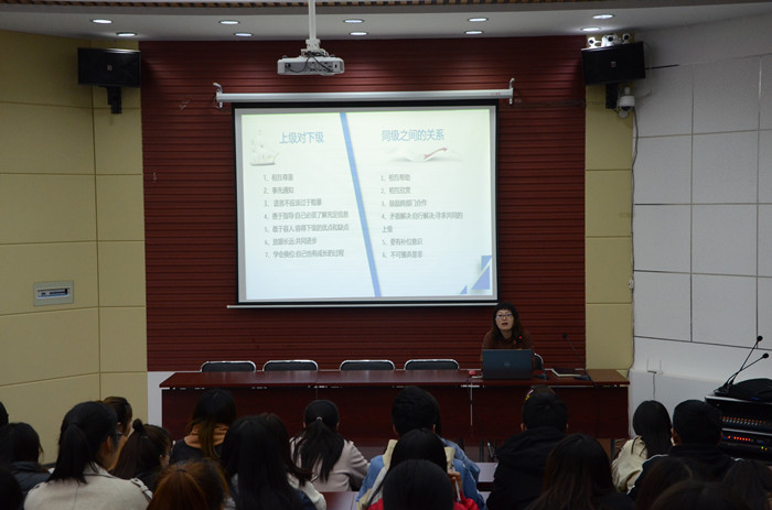 王青青以“学生干部的工作方法”为本期讲坛主题,从人际协调、时间管理、组织活动、良好工作态度、工作的不足及提高等五个方面与在座的同学进行交流。结合实际的工作,她指出在工作中应相互尊重,养成随时做笔记的好习惯的重要性。在时间上,她告诉同学们要正确处理好学习与工作的关系,提高效率。在组织活动中,要集思广益,积极配合组织实施计划,在总结中不断完善提高。在工作中,要有信心、有责任心地对待每一份工作。最后她要求大家要处理好学习与工作的关系、发挥模范带头作用,成为青年人的行动标杆。