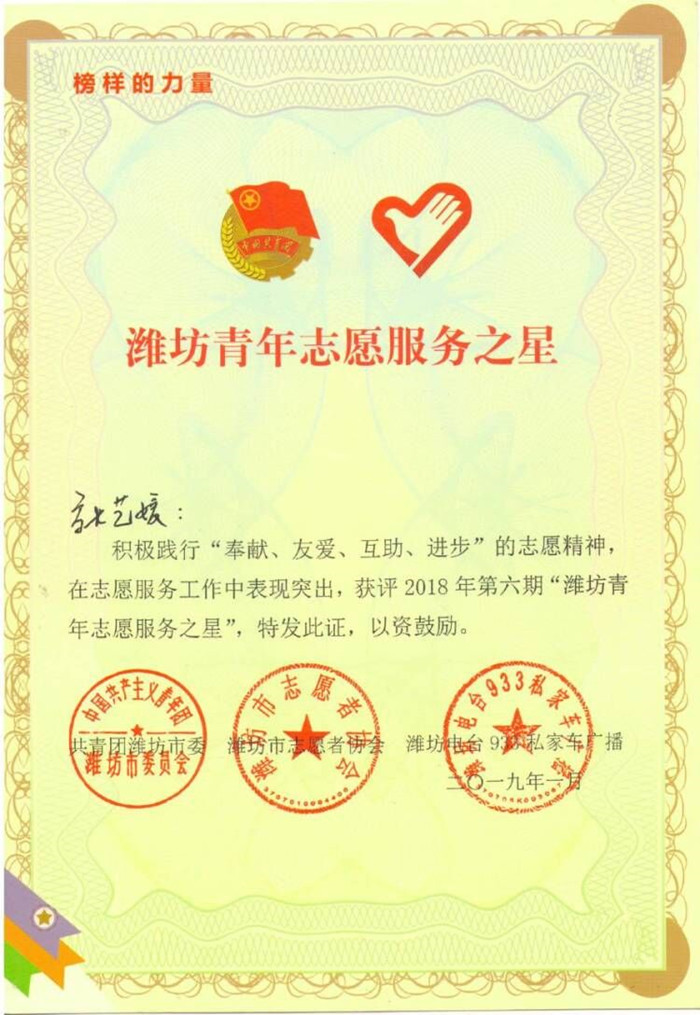 我院张艺媛同学荣获“潍坊青年志愿服务之星”荣誉称号