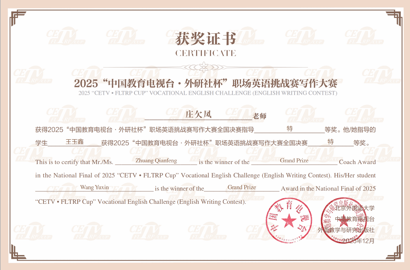 近日,在2025“中国教育电视台·外研社杯”职场英语挑战赛写作大赛全国总决赛中,学院庄欠凤老师指导的王玉鑫同学荣获全国总决赛特等奖。