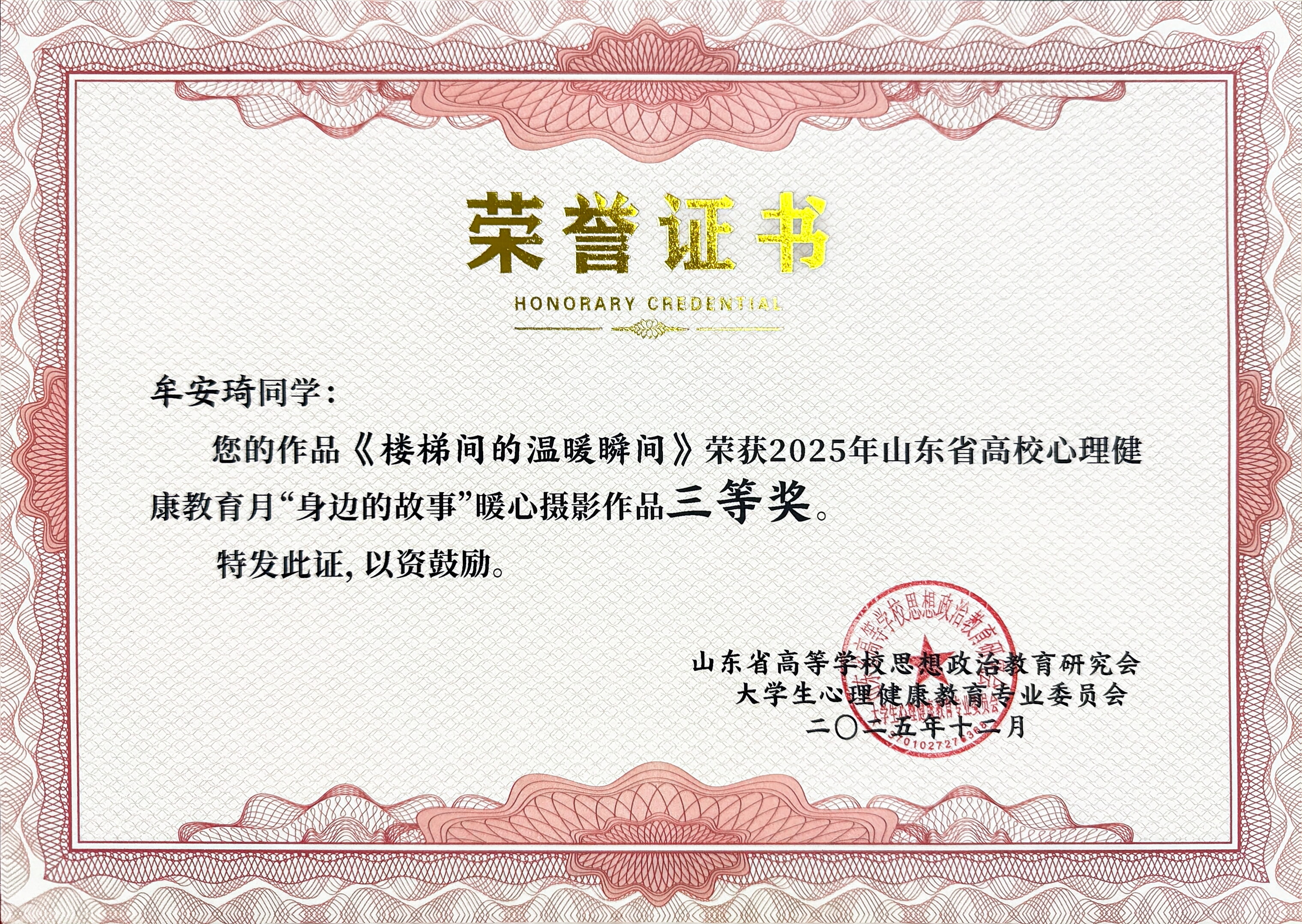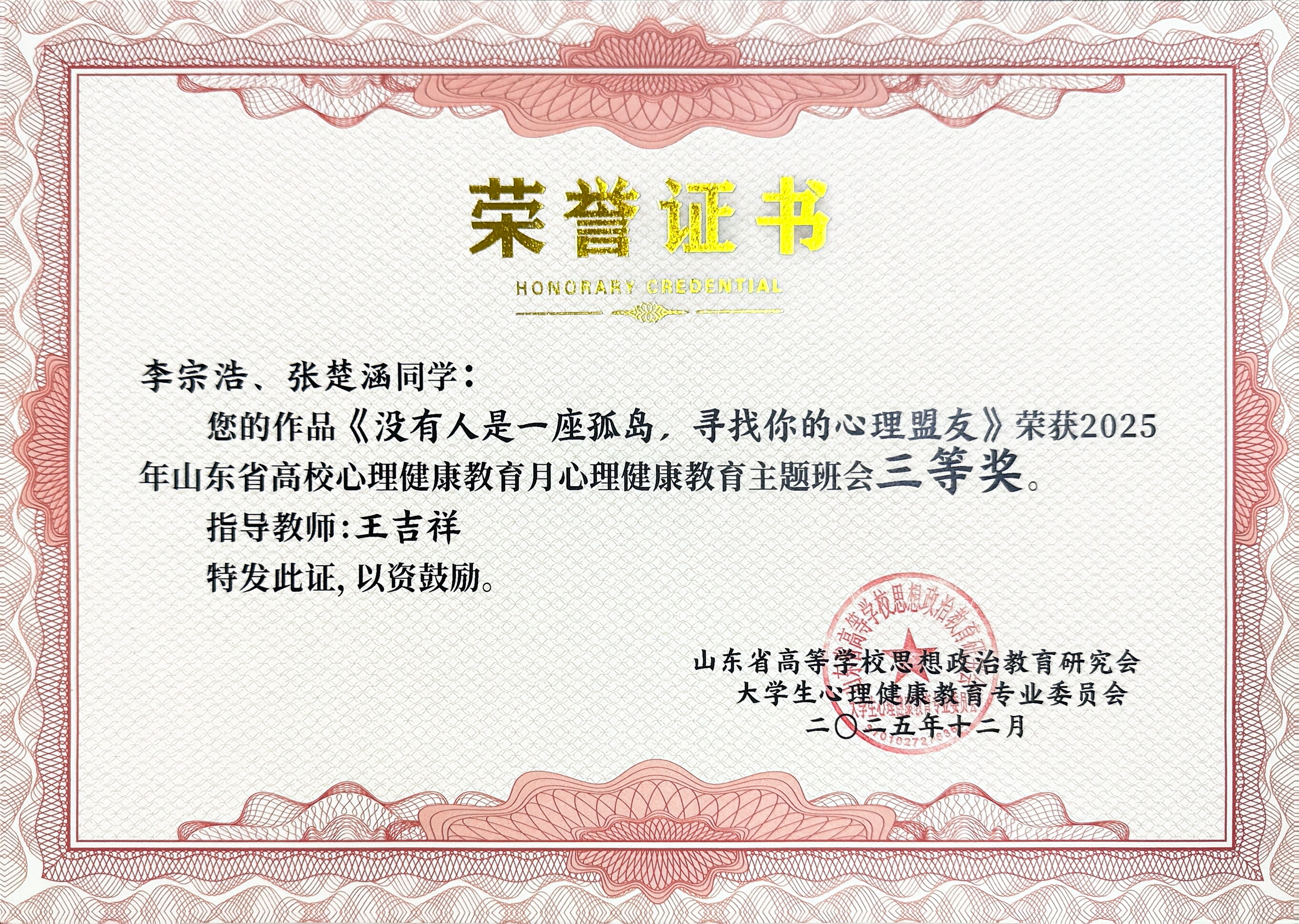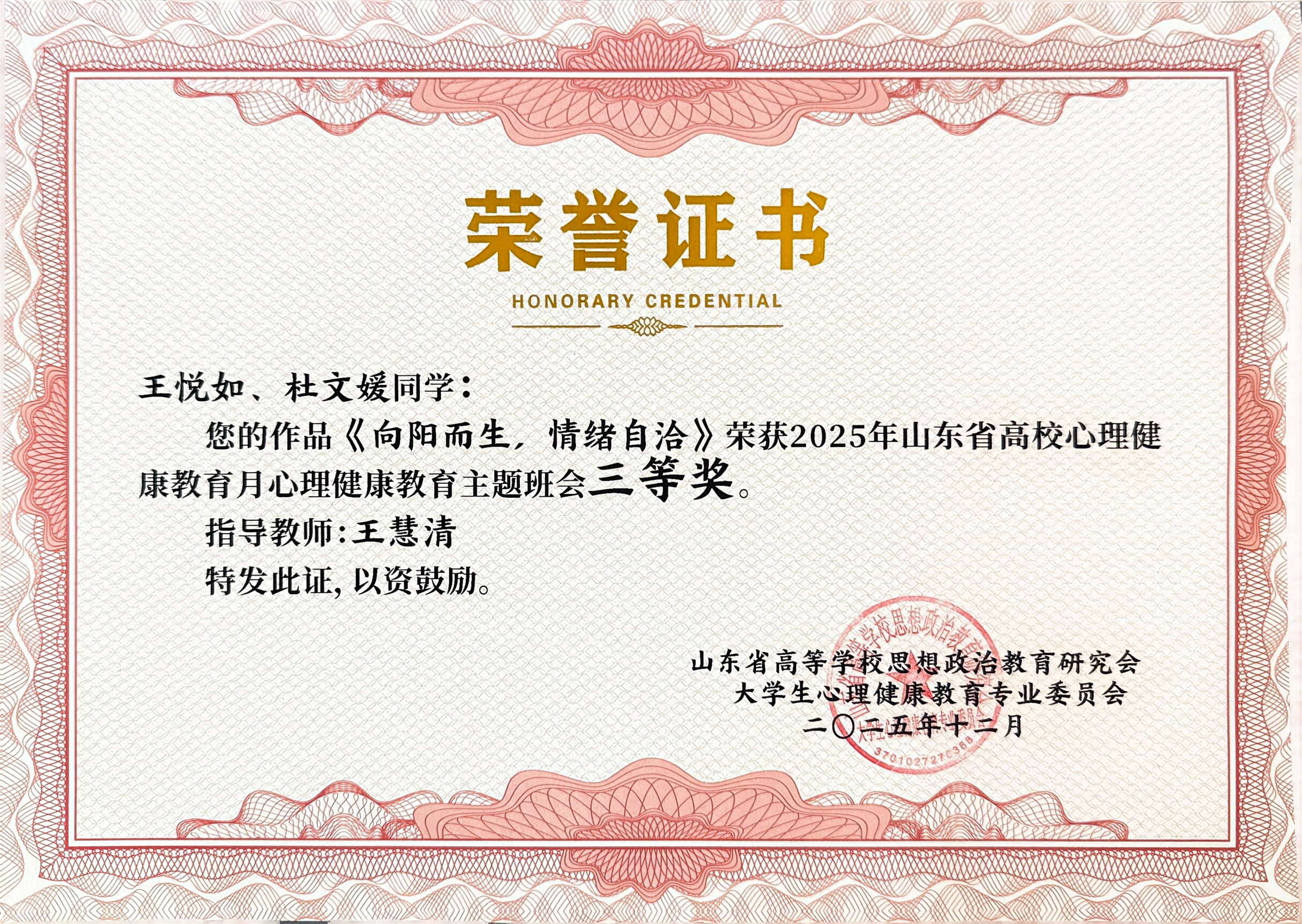 近日,山东省高等学校思想政治教育研究会大学生心理健康教育专业委员会公布2025年高校心理健康教育月活动评选结果,学院获七项省级荣誉。