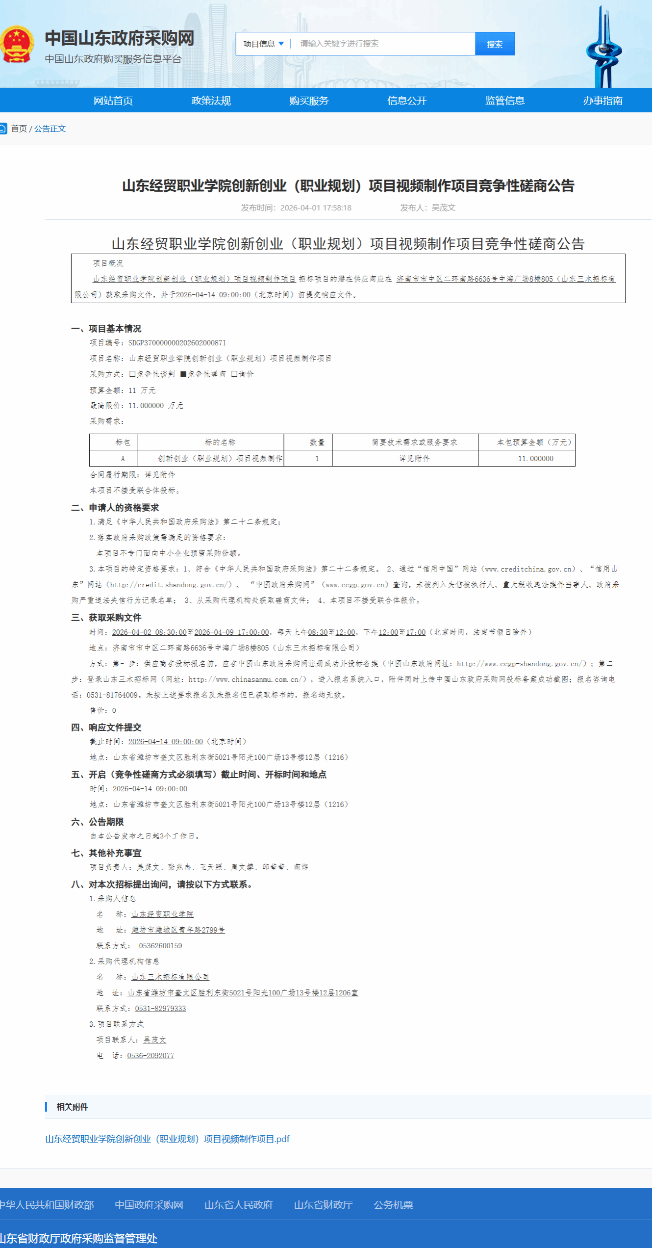 创新创业(职业规划)项目视频制作项目竞争性磋商公告