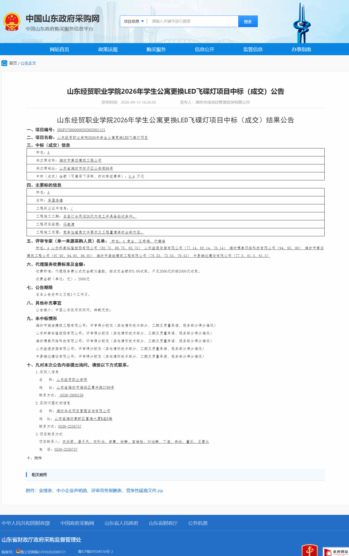 2026年学生公寓更换LED飞碟灯项目中标(成交)公告