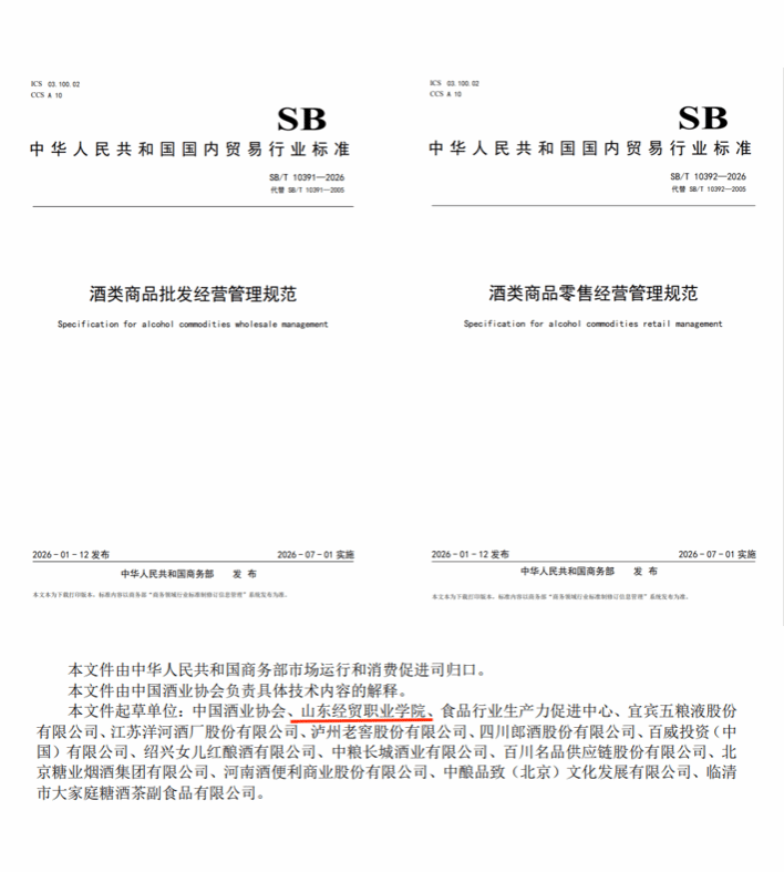 近日,商务部发布《酒类商品批发经营管理规范》(SB/T 10391-2026)与《酒类商品零售经营管理规范》(SB/T 10392-2026)两项行业标准。学院为主要起草单位,连锁经营与管理专业李加明老师担任主笔,全程参与起草、修订及定稿工作,为规范酒类流通市场、促进行业高质量发展提供了专业支撑。