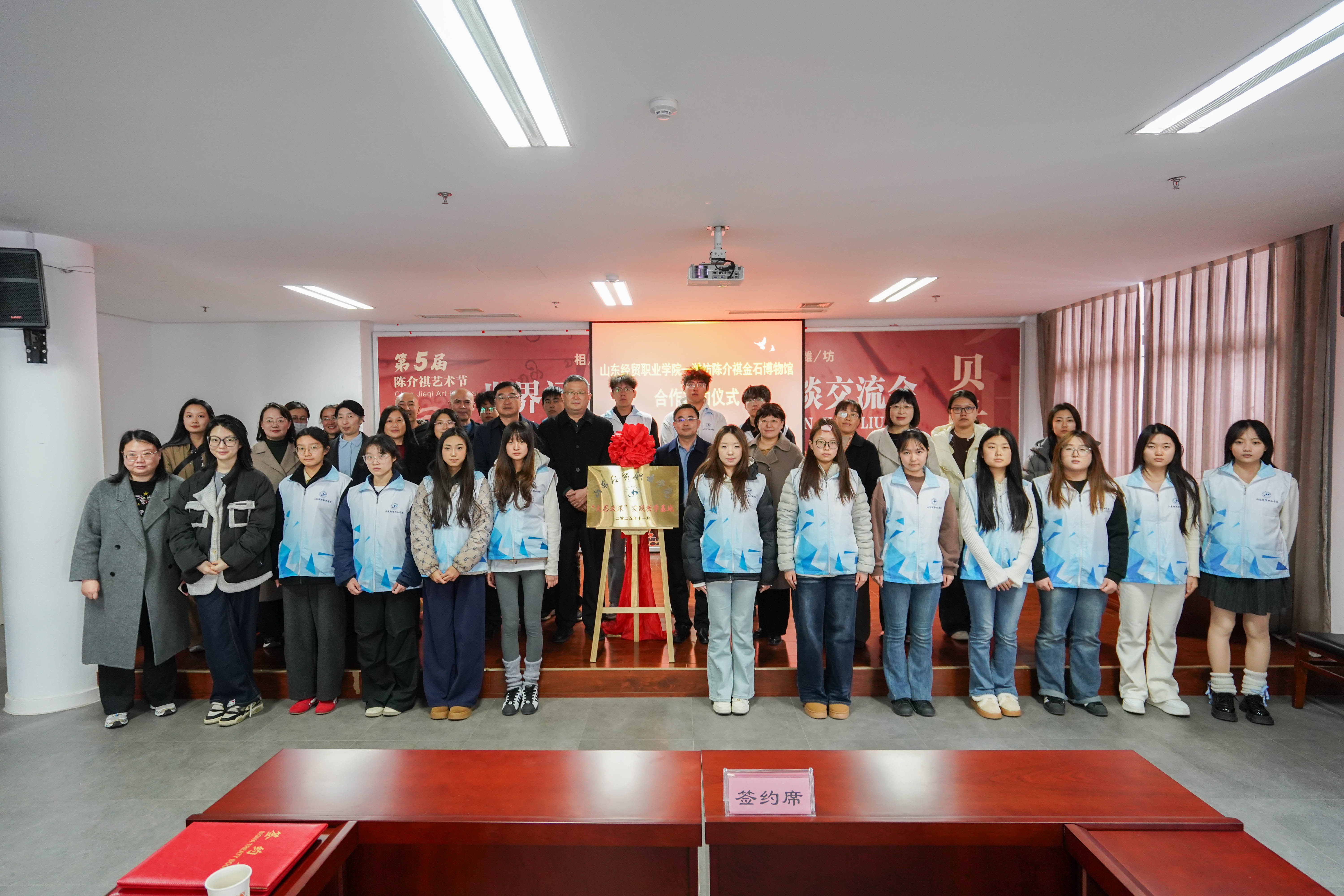 李海娜与陶琦签署馆校战略合作框架协议,刘涛与赵继民为“山东经贸职业学院大思政课实践教学基地”揭牌。