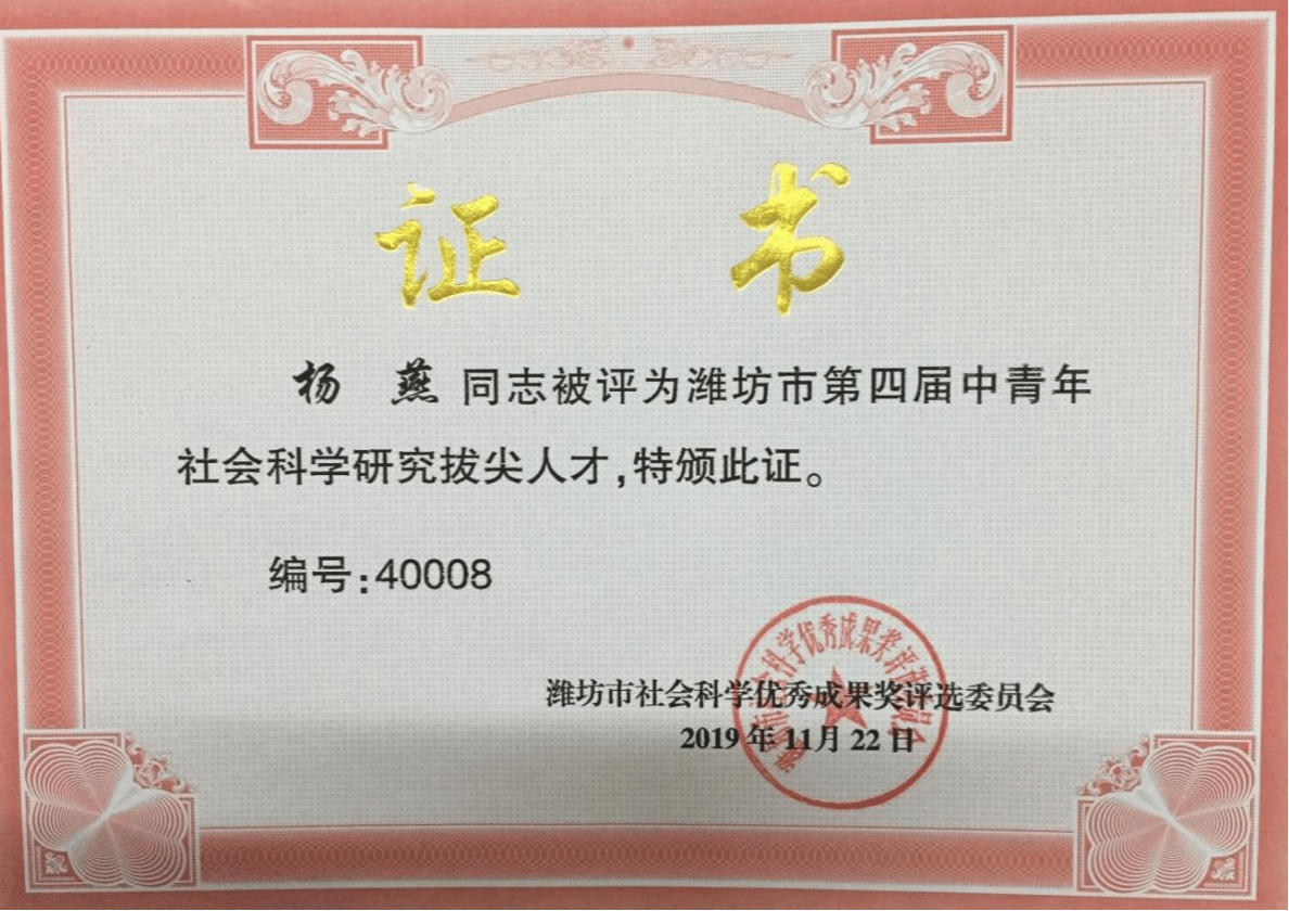 杨燕,中共党员,教授,山东省红色文化研究会副会长,首批山东高校“双带头人”教师党支部书记工作室负责人,国家精品在线开放课程主讲教师,山东学校优秀思政课教师,潍坊市有突出贡献中青年专家,潍坊市中青年社会科学研究拔尖人才,潍坊市思政课教师年度人物,潍坊市党史史志特约研究员。先后荣获潍坊市道德模范,潍坊市“新时代最美女性”、潍坊市“三八红旗手”、潍坊好人、山东好人、“中国好人”提名人选等荣誉称号。多次被评为学院优秀教师、优秀共产党员和山东省供销社先进个人。