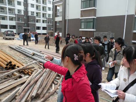 学生在建筑施工现场认识建筑材料、建筑结构